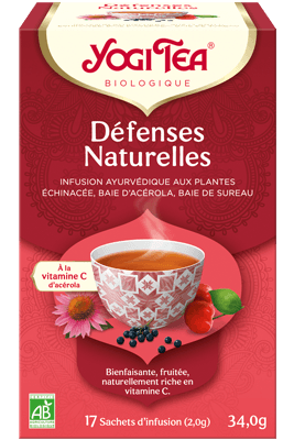 La nature est un allié puissant. Vivez en harmonie avec la elle et faites confiance à ses merveilles. Dans YOGI TEA® Défenses Naturelles, certaines de ses enchantements s’unissent : en plus d’une alimentation variée et équilibrée dans le cadre d’un style de vie sain, la vitamine C de l’acérola peut soutenir votre système immunitaire. Combinée à la légère amertume de l’échinacée et à la baie de sureau fruitée, cette infusion vous procure une expérience gustative agréable empreinte de bien-être.